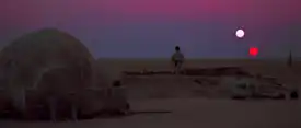 Tatooine originally featured in the 1977 film Star Wars, and was the first planet to be seen in the film franchise. In the opening scene, the planet and two of its moons are seen in space against a sea of stars, forming the backdrop of a space battle which sets in motion the events of the film. Two robots, C-3PO and R2-D2, jettison in an escape pod from a captured spaceship, the Tantive IV, and land on the surface of Tatooine. The droids lose their way in a sparse desert and are captured by small scavenger creatures called Jawas. When the robots are sold on to human settlers, protagonist Luke Skywalker is introduced as a young man living with his aunt and uncle on a farm. The hostility of the arid desert environment is emphasised by the depiction of sandstorms and the heat of the binary stars, as Luke watches a twin sunset over the sand dunes. Humans are constantly threatened by violent bandit creatures called Tusken Raiders. As the film progresses, various leading characters are introduced to the story in scenes set on Tatooine: Obi-Wan Kenobi, Han Solo and Chewbacca. Later Tatooine scenes take place in Mos Eisley, a gritty bustling spaceport on the planet which is a centre of smuggling and organised crime. One of the most celebrated scenes in the Star Wars saga is in the Mos Eisley cantina, a shady saloon populated by exotic alien species.[19][20] Composer John Williams wrote music for the alien band in this scene in the style of swing musician Benny Goodman, and arranged with unusual instrumentation to convey an other-worldly sound.[21] Tatooine features once again in the 1983 film Return of the Jedi, in which the story's heroes return to Tatooine to rescue Han Solo from Jabba the Hutt, a fearsome gangster who dominates the criminal underworld on Tatooine.