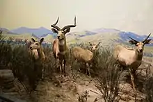 The mountain nyala was first described by English naturalist Richard Lydekker in 1910. Its scientific name is Tragelaphus buxtoni. The species has been classified under the genus Tragelaphus of the family Bovidae.[2] The mountain nyala was first brought to England in 1908 by Major Ivor Buxton, after whom the species has been named. Major Buxton, who had returned from a hunting trip in Ethiopia, first presented a specimen he had shot to British taxidermist Rowland Ward, who later on notified Lydekker about the discovery. It was the last large antelope to be discovered in Africa.[3][4] The spiral horns and white markings on the face and across the flanks established it as a species of Tragelaphus.[5] Lydekker believed that the species was related more closely to the nyala (T. angasii) than to the two kudu species (then placed under the genus Strepsiceros). In fact, mountain nyala's similarity to both Tragelaphus and Strepsiceros led to the merger of the latter into the former genus.[6][7]