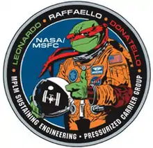 Since the module names are also the names of three of the four Teenage Mutant Ninja Turtles, the NASA MPLM Group approached Mirage Studios artist A.C. Farley to design a logo featuring Raphael in an astronaut flight suit.[4] There were cloisonné pins produced, as well as stickers and embroidered patches. Because the Ninja Turtles were created by Mirage Studios and owned by them at the time (now owned by Paramount Global, formerly ViacomCBS, via Nickelodeon), NASA gave Mirage the copyright to the logo in exchange for the use of the studio's character on it.[4]