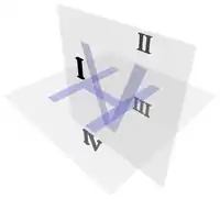 Modern orthographic projection is derived from Gaspard Monge's descriptive geometry.[4] Monge defined a reference system of two viewing planes, horizontal H ("ground") and vertical V ("backdrop"). These two planes intersect to partition 3D space into 4 quadrants, which he labeled: