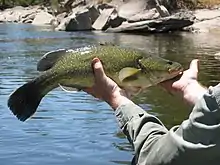 Consequently, Murray cod inhabit a remarkably wide variety of habitats, from cool, clear, fast-flowing streams with riffle-and-pool structure and rocky substrates in upland areas to large, slow flowing, meandering rivers in the extensive alluvial lowland reaches of the Murray-Darling basin.[6][8] [10][11] Murray cod have died out in many of their upland habitats, particularly in the southern Murray-Darling basin, due to a combination of overfishing, siltation, dams and weirs blocking migration, pollution from arsenic-based sheep-dips, mining, and in some cases, introduced trout stockings, which causes competition between juvenile Murray cod and introduced trout species.[11][20] [21] Murray Cod have also been introduced into other drainage basins, such as the Cooper Basin in Queensland.[22]