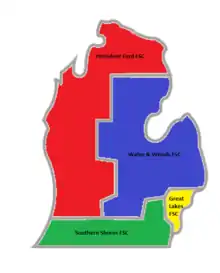 As of 2021, Michigan Crossroads council has absorbed it's Field Service Councils and is now divided into two administrative divisions. These divisions are formally called the President Ford Division, encompassing most of the western counties of Michigan's lower peninsula; and the Great Lakes Division encompassing the lower peninsula's eastern counties.
