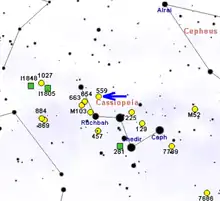 NGC 559 (also known as Caldwell 8) is an open cluster and Caldwell object in the constellation Cassiopeia. It shines at magnitude +9.5. Its celestial coordinates are RA 01h 29.5m , dec +63° 18′. It is located near the open cluster NGC 637, and the bright magnitude +2.2 irregular variable star Gamma Cassiopeiae. The cluster is 7 arcmins across.[2]
