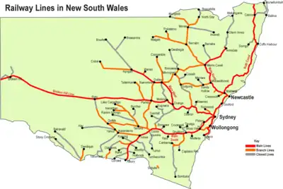 The standard gauge connection from Albury to Melbourne was opened in 1962, completing the Sydney–Melbourne railway.[8] Lines were built to connect the ports of Sydney and Newcastle to the rural interior, and the Main Western line was built from Parramatta Junction line to the north west of the state, reaching Bourke between 1860 and 1885.[11] The Main North line was built from Newcastle to Wallangarra on the Queensland border and connecting with Queensland Railway's line to Brisbane at a break of gauge between 1857 and 1888. Sydney and Newcastle were connected in 1889.[12]