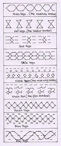 Most nakshi kanthas have some kind of border. Either a sari border is stitched on or a border pattern is embroidered around the kantha. The common border found in kanthas are as follows:[22]