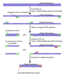 The product from the first reaction undergoes a second run with the second set of primers, shown in red. It is very unlikely that any of the unwanted PCR products contain binding sites for both the new primers, ensuring the product from the second PCR has little contamination from unwanted products.