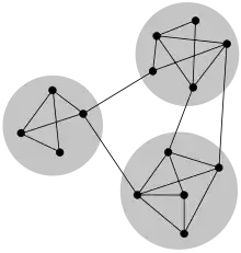 Fig. 1: A sketch of a small network displaying community structure, with three groups of nodes with dense internal connections and sparser connections between groups.