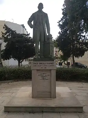 • Per l'Apertura della Società Maltese di Scienze e Lettere ("Opening of the Society for Sciences and Letters"; 1864).[14][45] – Printed at the Albion Press, Malta, and containing 35 pages, this little tract might stand as a typical composition relative to Zammit's liberal phase. The work reproduces the talk which Zammit gave at the launching of the said society on 22 October 1864. In the address, Zammit gave a positive account of the arts and sciences of his times. Art and science were responsible for the qualitative improvement man experienced in modern times, he states. Zammit pointed out to the need that science should always be considered in connection with industry. He stressed that academia should not be just intellectual clubs, but should also give a positive contribution to society. In the discourse, on can find a lot of empiricist and utilitarian innuendoes.