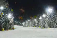 Night skiing is the sport of skiing or snowboarding after sundown, offered at many ski areas. There are usually floodlights – including LED lamps[1] along the piste which allow for better visibility. The night skiing session typically begins around sunset, and ends between 8:00 PM and 10:30 PM.[2]