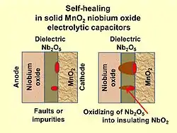 | Niobium e-caps, solid MnO2 electrolyte | stable | no unique determinable | Thermally induced insulation of faults in the dielectric by reduction of Nb2O5 into insulating NbO2 | niobium anode: voltage derating 50% niobium oxide anode: voltage derating 20%[23][24] |
