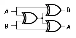 In von Neumann's original cellular automaton, the crossing of signals is much more difficult. The most widely used signal crossing organs are the coded channel (devised by von Neumann himself), Gorman's real-time crossing organ, and the Mukhopadhyay crossing organ. The coded channel can only cross individual pulses; the others are capable of crossing entire packets without interference, analogous the crossing organ in Nobili's cellular automaton. The Mukhopadhyay crossing organ comprises three XOR gates, in the arrangement shown.