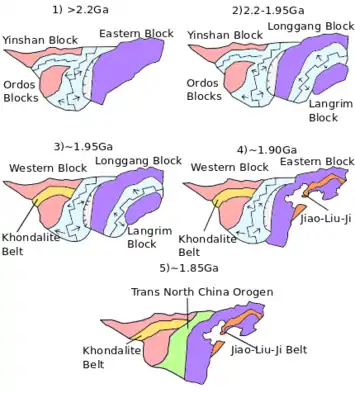 In the Paleoproterozoic time (2.5–1.6 billion years ago), the North China Craton amalgamated in three steps, with the final amalgamation took place 1.85 billion years ago.[5][9] Based on the metamorphic ages in the Trans North China Orogen, the assembly and the formation process of the North China Craton is determined.[5][9] Zhao proposed that the North China Craton was formed from 4 blocks, the Yinshan Block, the Ordos Block, the Longgang Block and the Langrim Block.[5][9] The Yinshan and Ordos Blocks collided and formed the Western Block, creating the Khondalite Belt 1.95 billion years ago.[5][9] For the Eastern Block, there was a rifting event in the Jiao-Liao-Ji Belt, which separated the Longgang Block and the Langrim Block with an ocean before the block was formed 2.1 to 1.9 billion years ago.[5][9] A rifting system is proposed because of how the rocks were metamorphosed in the belt and symmetrical rocks have been found on both side of the Belt.[5][9] Around 1.9 billion years ago, the rift system at the Jiao-Liao-Ji Belt switched to a subductional and collisional system.[5][9] The Longgang Block and the Langrim Block then combined, forming the Eastern Block.[5][9] 1.85 billion years ago, the Trans North China Orogen was formed by the collision of the Eastern and Western Blocks in an eastward subduction system, with probably an ocean between the 2 blocks subducted.[2][5][9][14]