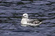 The northern fulmar (Fulmarus glacialis), fulmar,[2] or Arctic fulmar[3] is a highly abundant seabird found primarily in subarctic regions of the North Atlantic and North Pacific oceans. There has been one confirmed sighting in the Southern Hemisphere, with a single bird seen south of New Zealand.[4] Fulmars come in one of two color morphs: a light one, with white head and body and gray wings and tail, and a dark one, which is uniformly gray. Though similar in appearance to gulls, fulmars are in fact members of the family Procellariidae, which include petrels and shearwaters.