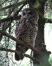 The northern spotted owl (Strix occidentalis caurina) is one of three spotted owl subspecies. A western North American bird in the family Strigidae, genus Strix, it is a medium-sized dark brown owl native to the Pacific Northwest. An important indicator species, the northern spotted owl remains threatened due to continued population decline from human-caused habitat destruction and competition with invasive species, its main competitor being the barred owl.