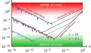 For basic central differences, the optimal step is the cube-root of machine epsilon.[7] For the numerical derivative formula evaluated at x and x + h, a choice for h that is small without producing a large rounding error is (though not when x = 0), where the machine epsilon ε is typically of the order of 2.2×10−16 for double precision.[8] A formula for h that balances the rounding error against the secant error for optimum accuracy is[9]