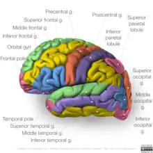 Diagram of gyri of brain viewed on lateral hemisphere. Occipital gyri shown lower right