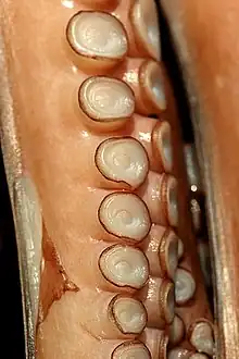 The O. minor, similar to the rest of its order Octopoda, is bilaterally symmetrical along a dorsoventral axis with two eyes and mouth surrounded by eight webbed arms.[8] These arms contain two-thirds of the octopus's neurons.[9] On the underside of these arms, O. minor has "suckers" which are circular, adhesive suction cups. These are predominantly used for manipulation, navigation, and for preparing food.[8][9] O. minor has a bulbous mantle and visceral hump which contains the majority of its fundamental organs.[10]