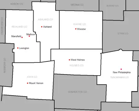 In 2001, local athletic directors met in Mansfield, Ohio to discuss the formation of a new athletic conference; seven schools agreed to form the Ohio Cardinal Conference.[1] Five of the initial member schools came from the disbanding Ohio Heartland Conference: Ashland, Lexington, Mansfield Madison, Mansfield Senior, and Orrville.[2] West Holmes joined from the Mohican-Area Conference, and Wooster from the Federal League.[2] Clear Fork, the only non-original member of the conference, joined for the 2004-05 season.