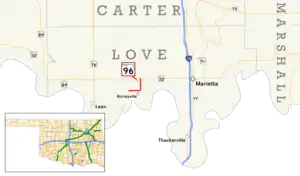 State Highway 96 (abbreviated SH-96) is a short, four-mile (6.4 km) highway in Love Co., Oklahoma. It runs south from State Highway 32 to Burneyville, curves west and turns into Burneyville Road. It has no lettered spur routes.