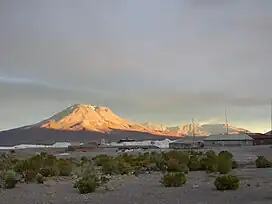 A major fumarole is active on the summit of the volcano, its plume reaching heights of 100 metres (330 ft).[50] It is strong enough that it can be seen on the ground from over 10 kilometres (6.2 mi) away.[85] The vent of the fumarole lies in the summit lava domes,[50] more specifically in a 200 metres (660 ft) high and 350 metres (1,150 ft) wide collapse scar in the southeasternmost lava dome of the compound summit lava dome.[34] Other volcanoes in the area with fumarolic activity include San Pedro and Putana.[86]