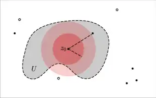 The image of the ball B, f(B) is a subset of the image of U, f(U). Thus w0 is an interior point of f(U). Since w0 was arbitrary in f(U) we know that f(U) is open. Since U was arbitrary, the function f is open.