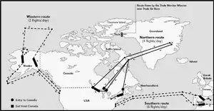 Operation Chrome Dome flight routes proposed in October 1961; this image comes from Canadian Royal Air Force files and so is focused on the aspects of the flight that overlapped with Canadian airspace, but part of the Mediterranean route is also visible, as is the observation of the Thule early warning site.