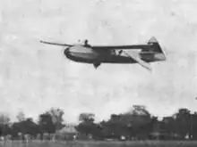 Around 1960, Percival Spencer successfully flew a series of uncrewed ornithopters using internal combustion engines ranging from 0.020-to-0.80-cubic-inch (0.33 to 13.11 cm3) displacement, and having wingspans up to 8 feet (2.4 m).[8] In 1961, Percival Spencer and Jack Stephenson flew the first successful engine-powered, remotely piloted ornithopter, known as the Spencer Orniplane.[9] The Orniplane had a 90.7-inch (2,300 mm) wingspan, weighed 7.5 pounds (3.4 kg), and was powered by a 0.35-cubic-inch (5.7 cm3)-displacement two-stroke engine. It had a biplane configuration, to reduce oscillation of the fuselage.[10]