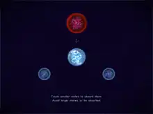 The aim of the game is to propel oneself, a single-celled organism ("Mote"), into other smaller motes to absorb them. Colliding with a mote larger than the player will cause the player to be absorbed, resulting in a game over. Motes smaller than the player are blue, while motes bigger than the player are red. Changing course is done by expelling mass. Due to conservation of momentum, this results in the player's mote moving away from the expelled mass, but also in one's own mote shrinking.