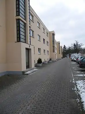 It was only with the florally named "Blumläger Field Settlement" ("Siedlung Blumläger Feld") of 1930/31 that it became possible to apply the planned rents.[5] An unusual feature of this development was that each residential unit was assigned its own tenants' garden, directly accessible at the ground floor level. The incorporation of gardens gives the development a "garden city" character.[5] The settlement was partly torn down in 2003, but the second phase, on the north side of the "Galgenberg" Street, remains fully preserved from that redevelopment.[7]