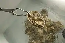 Bivalves, including oysters, are effective filter feeders and can have large effects on the water columns in which they occur.[14] As filter feeders, oysters remove plankton and organic particles from the water column.[15] Multiple studies have shown individual oysters are capable of filtering up to 190 litres (42 imp gal; 50 US gal) of water per day, and thus oyster reefs can significantly improve water quality and clarity.[16][17][18][19] Oysters consume nitrogen-containing compounds (nitrates and ammonia), phosphates, plankton, detritus, bacteria, and dissolved organic matter, removing them from the water.[20] What is not used for animal growth is then expelled as solid waste pellets, which eventually decompose into the atmosphere as nitrogen.[21] In Maryland, the Chesapeake Bay Program had implemented a plan to use oysters to reduce the amount of nitrogen compounds entering the Chesapeake Bay by 8,600 t (9,500 short tons) per year by 2010.[22] Several studies have shown that oysters and mussels have the capacity to dramatically alter nitrogen levels in estuaries.[23][24][25] In the U.S., Delaware is the only East Coast state without aquaculture, but making aquaculture a state-controlled industry of leasing water by the acre for commercial harvesting of shellfish is being considered.[26] Supporters of Delaware's legislation to allow oyster aquaculture cite revenue, job creation, and nutrient cycling benefits. It is estimated that one acre (0.40 ha) can produce nearly 750,000 oysters, which could filter between 57,000 to 150,000 m3 (2.0–5.3 million cu ft) of water daily.[26] Also see nutrient pollution for an extended explanation of nutrient remediation.