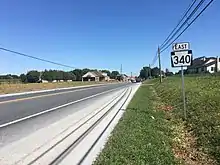 PA 340 begins at an intersection with PA 462 in the community of Bridgeport in East Lampeter Township, Lancaster County, heading east on two-lane undivided Old Philadelphia Pike. The road runs through areas of homes and businesses, passing south of the Harrisburg Area Community College Lancaster Campus before briefly forming the border between the city of Lancaster to the north and East Lampeter Township to the south. Farther east, the route heads between industrial parks to the north and neighborhoods to the south before coming to a partial interchange with the US 30 freeway that does not have a ramp from westbound US 30 to PA 340. Past this interchange, PA 340 runs through less dense areas of residential and commercial development with some farm fields.[2][3] At this point, the route enters the Pennsylvania Dutch Country of eastern Lancaster County, which is home to many Amish farms and businesses catering to tourists.[4][5] The road enters the community of Smoketown and intersects the northern terminus of PA 896 to the south of Smoketown Airport. The route crosses Mill Creek and continues east to the community of Bird-in-Hand, where it passes under Amtrak's Keystone Corridor railroad line.[2][3]
