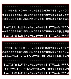 The character set was largely designed by Leonard Tramiel (the son of Commodore CEO Jack Tramiel) and PET designer Chuck Peddle.[1][2][3] The graphic characters of PETSCII were one of the extensions Commodore specified for Commodore BASIC when laying out desired changes to Microsoft's existing 6502 BASIC to Microsoft's Ric Weiland in 1977.[4] The VIC-20 used the same pixel-for-pixel font as the PET, although the characters appeared wider due to the VIC's 22-column screen. The Commodore 64, however, used a slightly re-designed, heavy upper-case font, essentially a thicker version of the PET's, in order to avoid color artifacts created by the machine's higher resolution screen. The C64's lowercase characters are identical to the lowercase characters in the Atari 800's system font (released several years earlier).