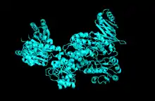 3-Phosphoglycerate dehydrogenase is a tetramer, composed of four identical, asymmetric subunits. At any time, only a maximum of two adjacent subunits present a catalytically active site; the other two are forced into an inactive conformation. This results in half-of-the-sites activity with regard to both active and allosteric sites, meaning that only the two sites of the active subunits must be bound for essentially maximal effect with regard to catalysis and inhibition respectively.[15] There is some evidence that further inhibition occurs with the binding of the third and fourth serine molecules, but it is relatively minimal.[13]