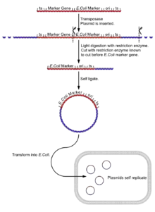 To use this as a useful and controllable genetic tool, the two parts of the P element must be separated to prevent uncontrolled transposition. The normal genetic tools are DNA coding for transposase with no transposase recognition sequences so it cannot insert and a "P Plasmid". P Plasmids always contain a Drosophila reporter gene, often a red-eye marker (the product of the white gene), and transposase recognition sequences. They may contain a gene of interest, an E. coli selectable marker gene, often some kind of antibiotic resistance, an origin of replication or other associated plasmid "housekeeping" sequences.