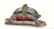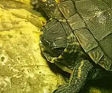 The painted turtle's generic name is derived from the Ancient Greek words for "gold" (chryso) and "freshwater tortoise" (emys); the species name originates from the Latin for "colored" (pictus).[12] The subspecies name, marginata, derives from the Latin for "border" and refers to the red markings on the outer (marginal) part of the upper shell; dorsalis is from the Latin for "back", referring to the prominent dorsal stripe; and bellii honors English zoologist Thomas Bell, a collaborator of Charles Darwin.[13][14] An alternate East Coast common name for the painted turtle is "skilpot", from the Dutch for turtle, schildpad.[15]