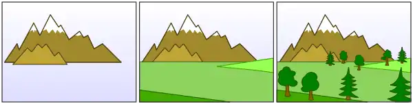 The distant mountains are painted first, followed by the closer meadows; finally, the trees, are painted. Although some trees are more distant from the viewpoint than some parts of the meadows, the ordering (mountains, meadows, trees) forms a valid depth order, because no object in the ordering obscures any part of a later object.