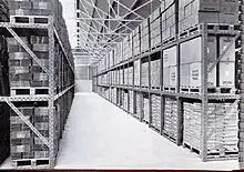 - ↑ U.S. Patent 4,715,765, Agnoff, Charles 12/29/1987, "Gravity Flow Storage System" Fig. 1 Shows Pallet on track and cart system.