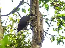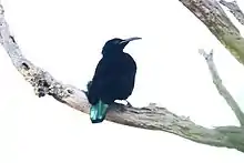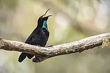 Breeding occurs from August to February, during the spring to summer months in Australia.[6] Like other birds of paradise, the paradise riflebird is promiscuous and polyginous.[9] The male paradise riflebird performs a solitary display to females from perches of low-hanging, exposed canopy.[12] Although individuals of the species are generally non-territorial, males are presumed to display territorial behavior over these perches during the mating season. The courtship display is composed of rapid side-to-side movements of the wings, which are held horizontally similar to other riflebirds, and head, with a gaping mouth and the iridescent blue-green sheen on the throat exposed.[6] It is also suggested that males have super black feathers which help to create an optical illusion during courtship that emphasizes the iridescent patches they are adjacent to.[7]