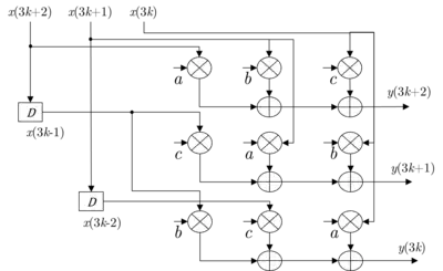 In digital signal processing (DSP), parallel processing is a technique duplicating function units to operate different tasks (signals) simultaneously.[1] Accordingly, we can perform the same processing for different signals on the corresponding duplicated function units. Further, due to the features of parallel processing, the parallel DSP design often contains multiple outputs, resulting in higher throughput than not parallel.