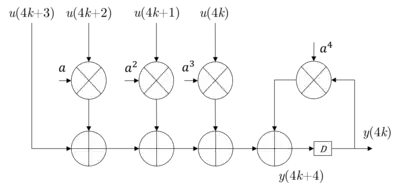Consider the design of a 4-parallel architecture (N = 4). In such parallel system, each delay element means a block delay and the clock period is four times the sample period.