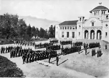 In 1873, Wilson was visited by Dr. Daniel M. Berry of Indiana who was looking for a place in the country that could offer a mild climate for his patients, most of whom suffered from respiratory ailments. Berry was an asthmatic and claimed that he had his best three night's sleep at Rancho San Pascual.[23] To keep the find a secret, Berry code-named the area "Muscat" after the grape that Wilson grew. To raise funds to bring the company of people to San Pascual, Berry formed the Southern California Orange and Citrus Growers Association and sold stock in it.[24] The newcomers were able to purchase a large portion of the property along the Arroyo Seco and on January 31, 1874, they incorporated the Indiana Colony. As a gesture of good will, Wilson added 2,000 acres (8 km2) of then-useless highland property, part of which would become Altadena. Colonel Jabez Banbury opened the first school on South Orange Grove Avenue. Banbury had twin daughters, named Jennie and Jessie. The two became the first students to attend Pasadena's first school on Orange Grove.[25]