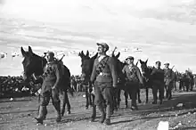 The M1951 Field Cap, introduced with the M1951 Uniform, was a derivative of the M1943 Field Cap, part of the M1943 Uniform.[2][1][3] The M1951 cap was worn in the Korean War, where it became known as the "patrol cap" by the US Army Rangers there.[1] It was constructed of wind-resistant olive-drab cotton poplin, and had a flannel wool panel that folded down to cover the ears and the back of the head.[1] It was soft enough to be worn underneath an M1 helmet.[1]