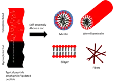 As with other amphiphilic molecules, above a critical aggregation concentration peptide amphiphiles associate through non-covalent interactions to form ordered assemblies of different sizes, from nanometres to microns.[12] Molecules that contain both polar and non-polar elements minimise unfavourable interactions with the aqueous environment via aggregation, which allows the hydrophilic moieties to be exposed to the aqueous environment, and the hydrophobic moieties to be protected. When aggregation occurs, a variety of assemblies can be formed depending on many parameters such as concentration, pH, temperature and geometry. The assemblies formed range from micelles to bilayer structures, such as vesicles, as well as fibrils and gels.[13]