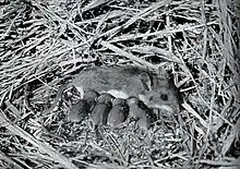 White-footed mice are omnivorous, and eat seeds and insects. They are particularly voracious predators of the pupal stage of the invasive spongy moth (formerly termed the gypsy moth).[5] They are timid and generally avoid humans, but they occasionally take up residence in ground-floor walls of homes and apartments, where they build nests and store food.[6] White-footed mice spend substantial time in trees and bushes, sometimes taking unoccupied old bird nests and building roofs on them.[7]