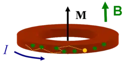 Persistent current schematic. The green arrow indicates the direction of static applied magnetic field B which allows a net current I (blue arrow) to flow and create a magnetization M (black arrow) by breaking the symmetry between clockwise and counterclockwise currents. The yellow dot represents an electron traversing the disordered material of the ring (green stars) without dissipation. A typical ring current is 1 nanoampere for a ring diameter of 0.6 micrometer at a temperature below 0.5 kelvin.[3]