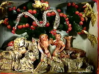 Nicario Jiménez Quispe (Quispe is his mother’s name) is a master artisan of the craft of making retablos. He was born in 1957 in a small highland Andean village near Ayacucho, and learned how to make retablos from his father and other skilled craftsmen. He has studied at the University of San Marcos in Lima, and has exhibited his retablos in Peru and abroad in several international competitions. His photo was taken while doing a demonstration at American University’s Language and Foreign Studies Department in 1991.