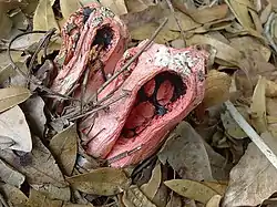 Species of stinkhorns have gasteroid, or internally produced spores. Fruit bodies originate as a gelatinous, spherical, or egg-shaped structure that may be completely or partially buried underground. The peridium, the outer layer of the egg, is white, or purple/red, with two or three layers. The outer layer is thin, membranous, and elastic, while the inner layer is thicker, gelatinous, and continuous. At maturity, the peridium opens up and remains as a volva at the base of the receptaculum.[5]