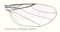 The Phoridae are a family of small, hump-backed flies resembling fruit flies. Phorid flies can often be identified by their escape habit of running rapidly across a surface rather than taking to the wing. This behaviour is a source of one of their alternate names, scuttle fly. Another vernacular name, coffin fly, refers to Conicera tibialis.[1] About 4,000 species are known in 230 genera. The most well-known species is cosmopolitan Megaselia scalaris. At 0.4 mm in length, the world's smallest fly is the phorid Euryplatea nanaknihali.[2]