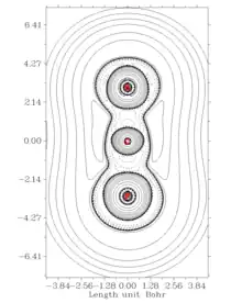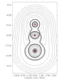 Figure 7: Contour plot of the Laplacian electron density of the PCO anion. Graph plotted in Multiwfn using the results of AIMS analysis from Molden and GAMESS.[7] From top to bottom, the atoms are O, C and P.