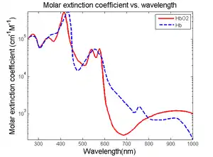 Visible light absorbers (λ = 400 to 700 nm) include oxyhemoglobin, deoxyhemoglobin, melanin, and cytochrome c. Visible light photoacoustic microscopy is particularly useful in determining hemoglobin concentration and oxygen saturation due to the difference in absorption profiles of oxyhemoglobin and deoxyhemoglobin. Real-time analysis can then be used to determine blood flow speed and oxygen metabolism rate.[3] In addition, photoacoustic microscopy is capable of early melanoma detection due to the high concentration of melanin found in skin cancer cells.